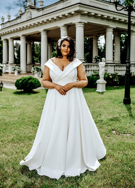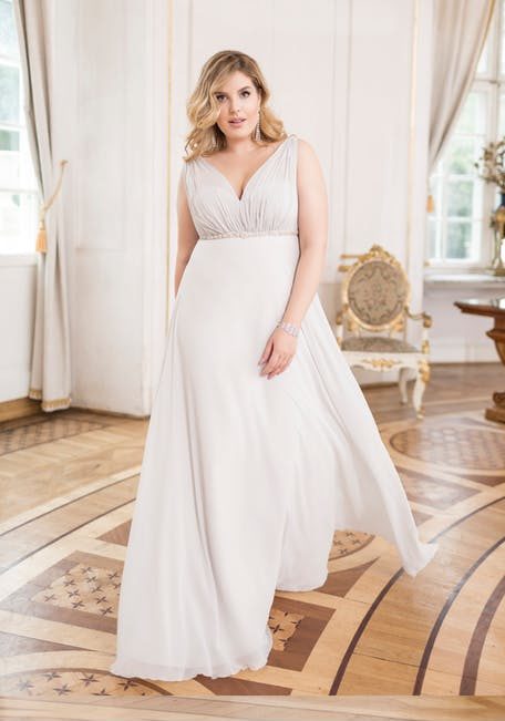 Если вы носите большие размеры или беременны и ищете более скромное свадебное платье, подумайте о модели, с вырезом под бюст (например, ампир), чтобы ткань свободно ниспадала вокруг живота. Классический крой тоже подойдет вам.