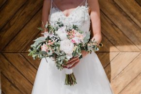 - Взгляните на ткань платья. Если на нем есть цветочные узоры, кружево или вышивка — выбирайте букет в подобном стиле.